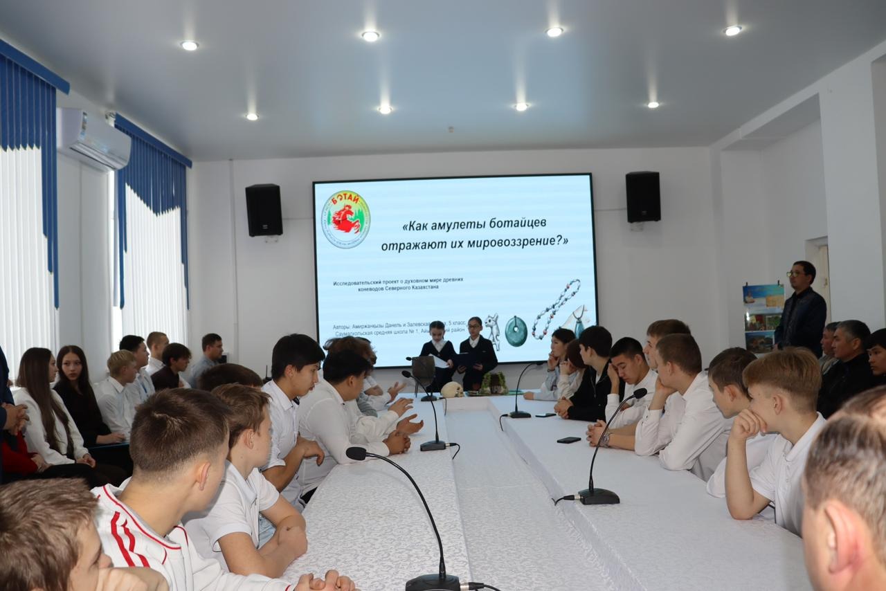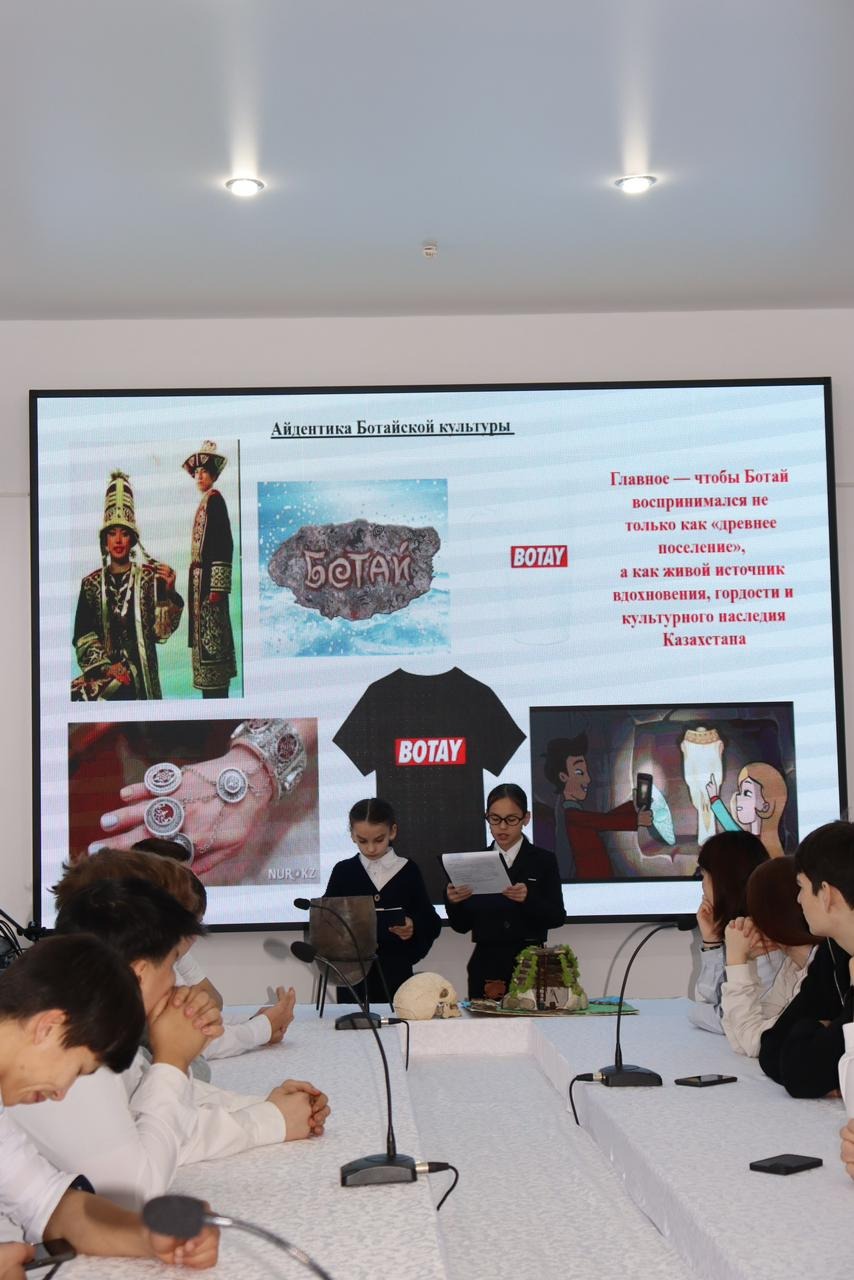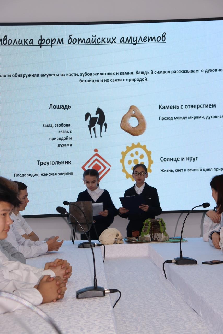 Атап айтқанда, Кисловская Арина «Ботай тұрғын үйлері — қазақстандық мемлекеттіліктің терең тамырларының символы ретінде»,Жақсыбаев Ратмир мен Мұрат Арлан «Ғажайып олжалар: ежелгі адамдар және жұмбақ операциялар»,Данель Әміржанова мен Янина Залевская «Ботай тұмарлары олардың дүниетанымын қалай көрсетеді?» тақырыптарында өз баяндамаларын ұсынды.